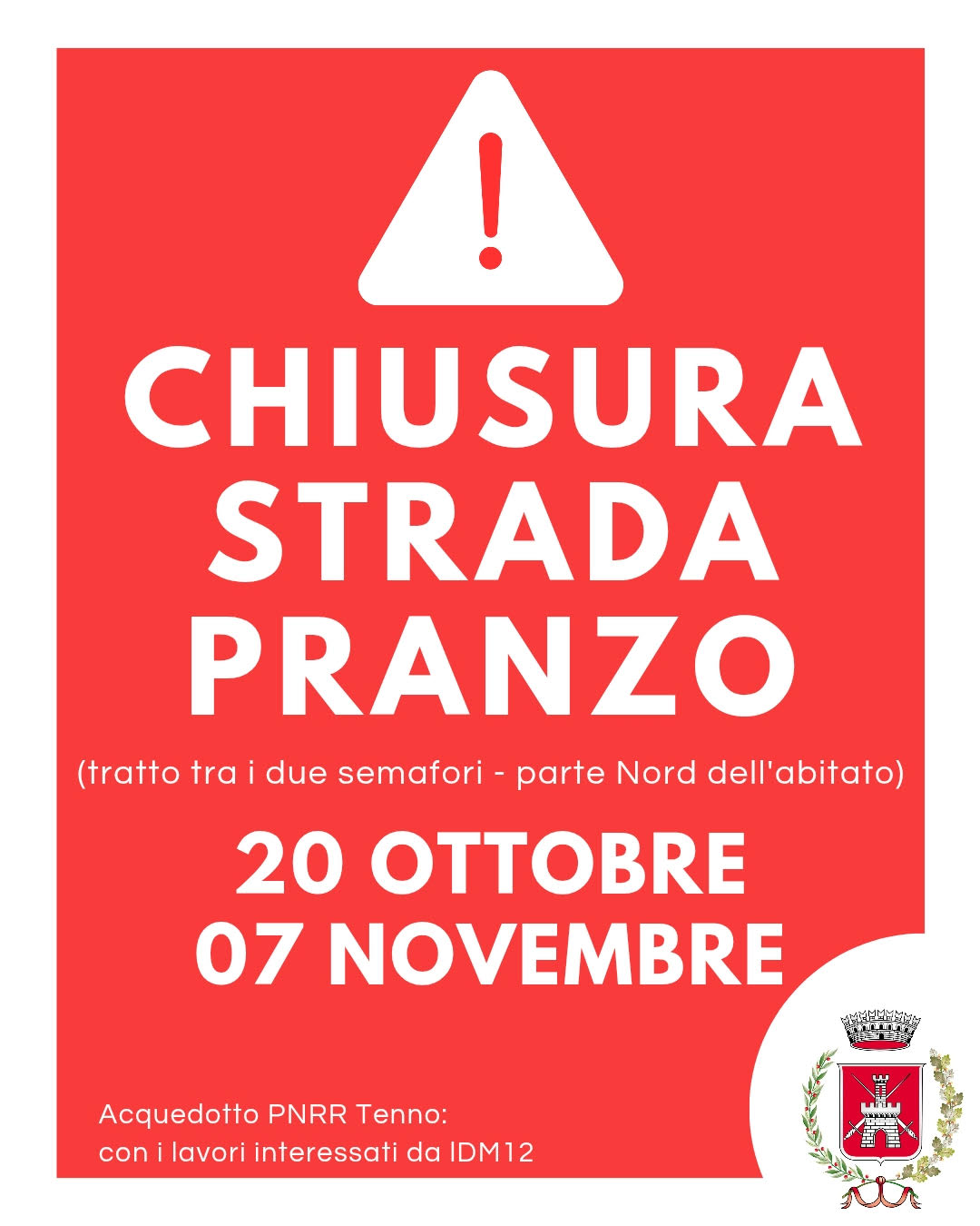 Il servizio gestione strade della Provincia Autonoma di Trento ha emanato un'ordinanza per la chiusura della SP 37, nella parte Nord dell'abitato di Pranzo di Tenno , nel tratto tra i due semafori, per i lavori relativi all'acquedotto finanziati dal PNRR.